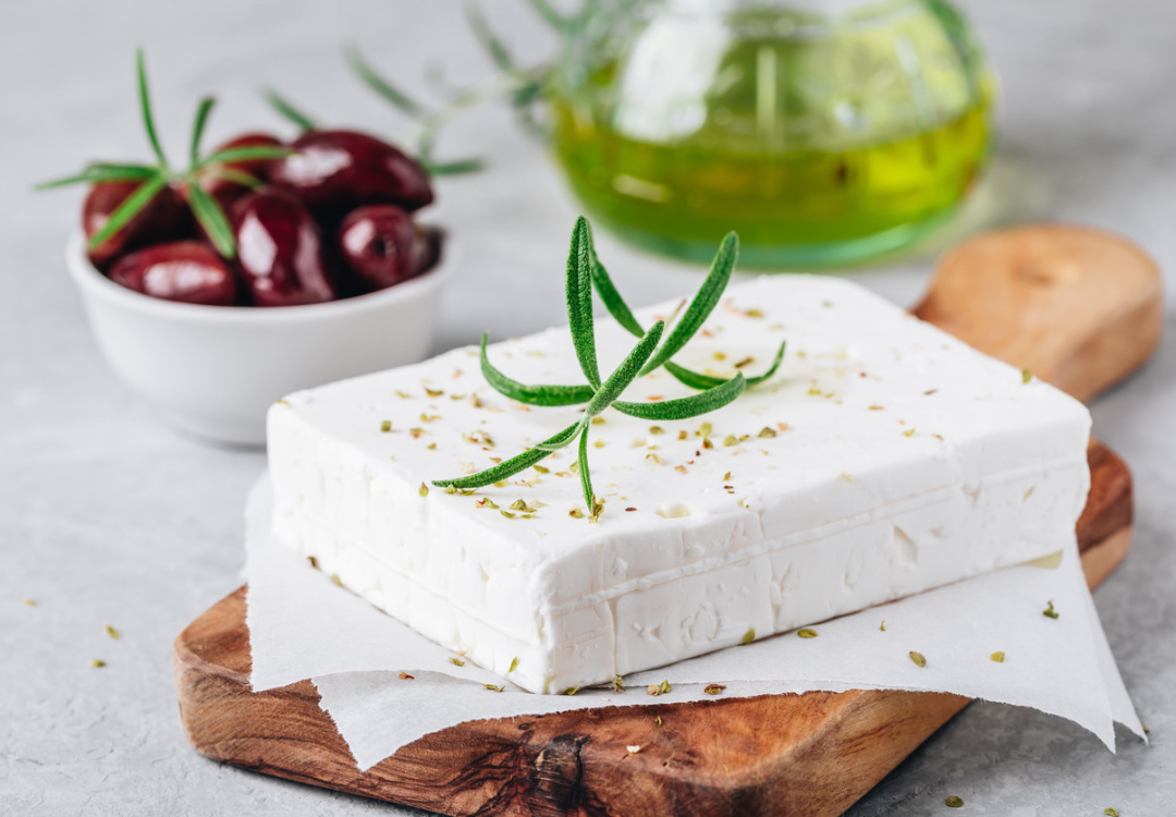 El queso feta es un queso blanco tradicionalmente elaborado con leche de oveja o de cabra. Es una buena fuente de proteínas y calcio, aunque puede ser más alto en sodio que otros quesos.